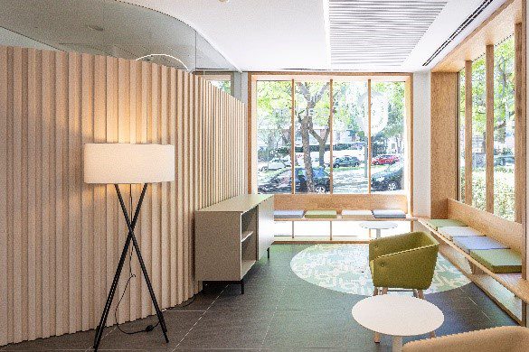 En este nuevo espacio -que cuenta con una superficie de 350 m² y con instalaciones integradas en el Campus Corachan tanto a nivel tecnológico como funcional- destaca el trabajo realizado por constructora 4Retail en la fachada del local, conformada por una gran cristalera con marcos de madera a lo largo de toda la planta del edificio. De igual forma, el trabajo de carpintería y revestimientos en el interior de las zonas de espera y tránsito genera un espacio de alto confort y calidad visual.