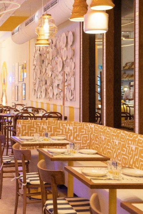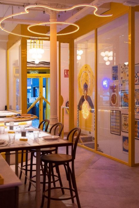 Su atmósfera dinámica desprende un espíritu joven y la pasión por la pasta, con el amarillo y el blanco como base en todo el interiorismo. Neones que simulan spaghetti, frases motivadoras relacionadas con el mundo de la pasta, un impresionante mural en 3D con los utensilios de cocina que intervienen en el proceso de creación de la pasta fresca…