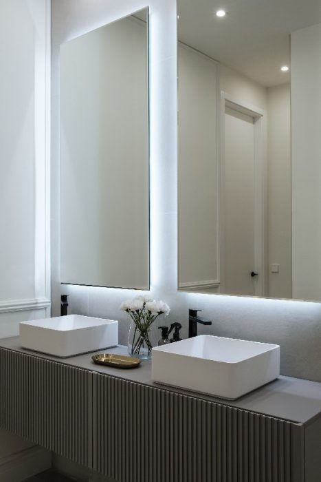 Dos lavamanos sobre encimera cuadrados, sendos espejos retroiluminados rectangulares y un mueble bajo lavabo en una tonalidad topo con un frontal de suaves líneas en relieve son los elementos protagonistas en el baño principal. Sobre el lavamanos destacan las dos griferías Project Tres en acabado negro mate que, con su diseño minimalista, aportan contraste y carácter al espacio.