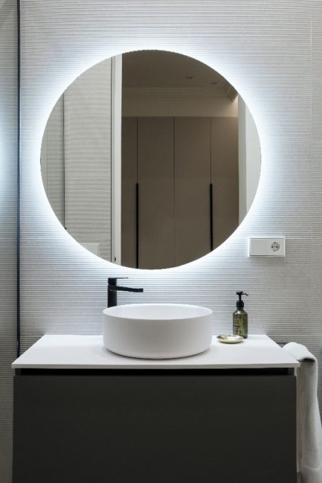 Las formas redondas del lavamanos sobre encimera y del espejo retroiluminado son una clara apuesta por el interiorismo de tendencia ‘bold’, llenando de dinamismo el baño de cortesía. La altura extra del grifo monomando XXL Project-Tres facilita la comodidad de uso en el lavado de manos en este tipo de lavabos sobre encimera.