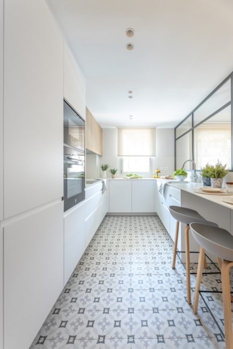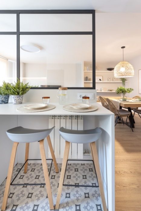 El pavimento de baldosas hidráulicas y una vidriera a media altura en hierro negro diferencia la cocina del resto de la zona de día.