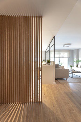 El recibidor queda abierto a la zona de día, solo un panel de listones de madera aporta la privacidad necesaria, a la vez que deja pasar la luz.