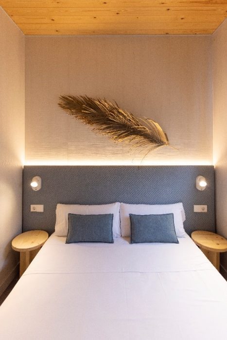 Una paleta de materiales naturales, como los techos y marcos de las puertas en pino natural barnizado o las lámparas de fibras naturales, contribuyen a generar esta sensación hogareña y permiten olvidar que se trata de edificaciones modulares. “Hemos querido llevar un trocito de la naturaleza del exterior al interior de estos bungalows” comenta Marc Borrós, de Borrós Interiorisme.