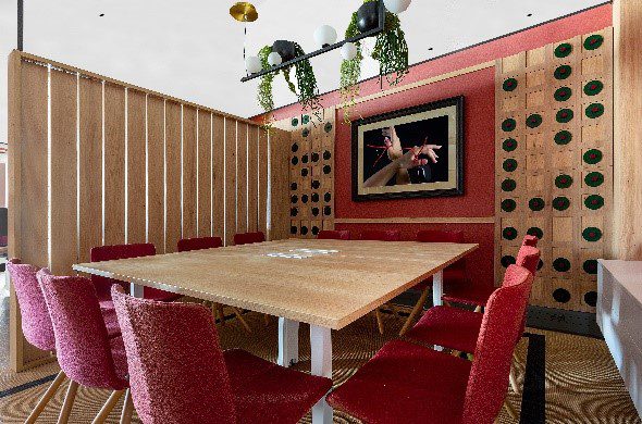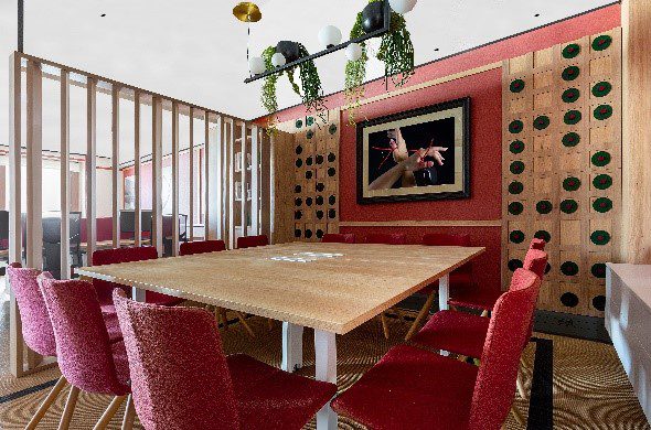 La armonía visual y el equilibrio son una constante, una invitación a disfrutar del trabajo en un ambiente relajado y optimista. Para lograrlo, José Lara Studio ha jugado con líneas rectas y formas orgánicas, vestidas con una paleta cromática que combina el rojo corporativo de la firma con blanco, madera y detalles que contrastan en negro.
