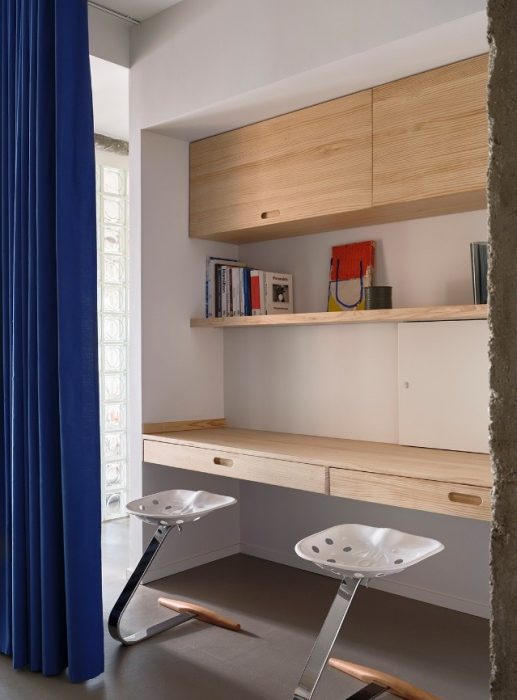 El espacio de trabajo se integra de forma inteligente, ocultándose tras una cortina azul de onda perfecta cuando no está en uso, manteniendo la serenidad visual del área social.