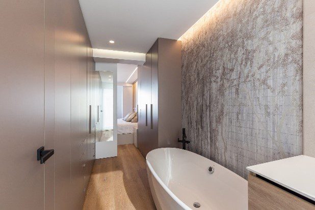 En el dormitorio principal, se ha buscado lograr una mayor amplitud colocando las diferentes piezas en línea, creando así un espacio que puede ser una única estancia luminosa, o bien dividirse al cerrar las puertas correderas integradas en los armarios del vestidor. Destaca en el baño principal una bañera exenta, situada junto a revestimiento con un papel decorativo, que aumenta la sensación de tranquilidad y relajación.