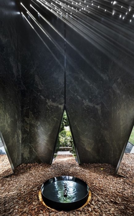 Con este espacio, disruptivo y rotundo, los antiguos jardines del palacete se transforman para renacer en un ambiente natural donde SUMMUMSTUDIO ha buscado mimetizar las superficies de piedra sinterizada de Neolith con el entorno. El visitante descubre un rincón asombroso, donde la luz y el agua evocan el paso del tiempo y nos recuerdan que la naturaleza es un reflejo de lo que somos, así como una fuente permanente de inspiración.