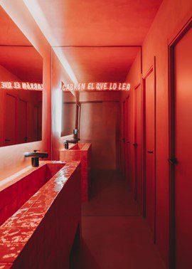 Un gran mural de Tato Reppeto, ilustrado con un guepardo alebrije y más formas abstractas, dan el toque picante y colorido a la sala y a la entrada a los baños. La fuerza monocolor de un rosa potente inunda absolutamente toda la zona de aseos, desde las puertas hasta el lavamanos.