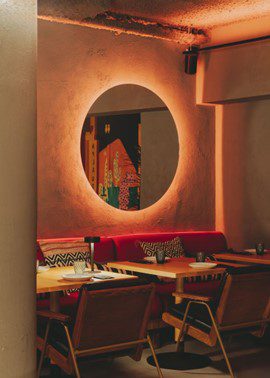 Destaca un neón con la atrevida frase “Cabrón el que lo lea” en un gran espejo que va de suelo a techo. Este diseño, que promete divertidas fotos instagrameables a los clientes, es obra del estudio Melón Yubari, autores de la gráfica y comunicación del restaurante Cabrón.