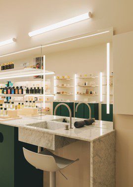 El color verde corporativo pondera en la tienda, aportando ritmo e identidad, y algunos elementos en madera de contrachapado de abedul dan el toque preciso de calidez y sencillez. Los estantes de distintos mármoles abujardados ponen la nota distinguida. Un gran lavamanos de mármol crea una zona íntima y ofrece el servicio para testear y compartir con el cliente.