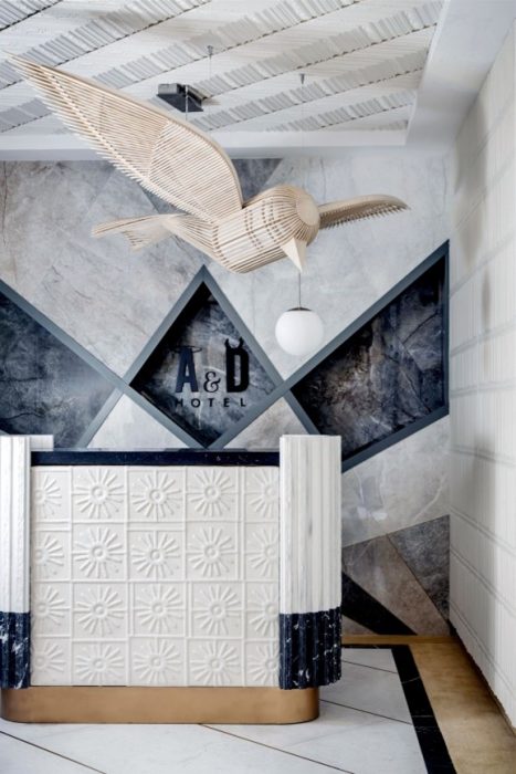- Artesanía: Por más avances tecnológicos y nuevos materiales que el mercado lance para facilitarnos la vida, las piezas de artesanía son un imprescindible en cualquier espacio de interiorismo porque nos devuelven a nuestros orígenes y nos llevan a reencontrarnos con nuestra esencia. De nuevo un contraste: lo viejo con lo nuevo, lo que está hecho a mano en contraposición a lo que fabrican las máquinas, la naturaleza frente a la tecnología. Alberto Aranda ha diseñado con gran mimo 7 esculturas que ha materializado una ceramista, piezas que representan los 7 pecados capitales. También buen ejemplo de artesanía es la gran lámpara de madera en forma de ave, realizada tras horas y horas de trabajo incansable por LZF Lamps en España, que corona el Front Desk del hall de hotel realizado por Alberto Aranda en Casa Decor.