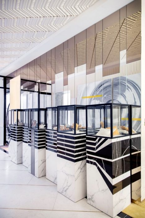 - Cromatismo blanco y negro: El cielo y el infierno, la pureza del blanco frente a la oscuridad del negro, el contraste más puro. Alberto Aranda se ha valido de la versatilidad de la cerámica cortada a láser de Porcelanitedos para crear un original pavimento, compuesto por diferentes piezas fabricadas especialmente para el espacio. De tal modo, se ha diseñado a medida un espectacular mosaico formado por un patrón de esferas en blanco y negro. Así mismo, el blanco y el negro brillan con elegancia en distintos pedestales cerámicos, que exponen los 7 pecados capitales enfrentados a sus virtudes.