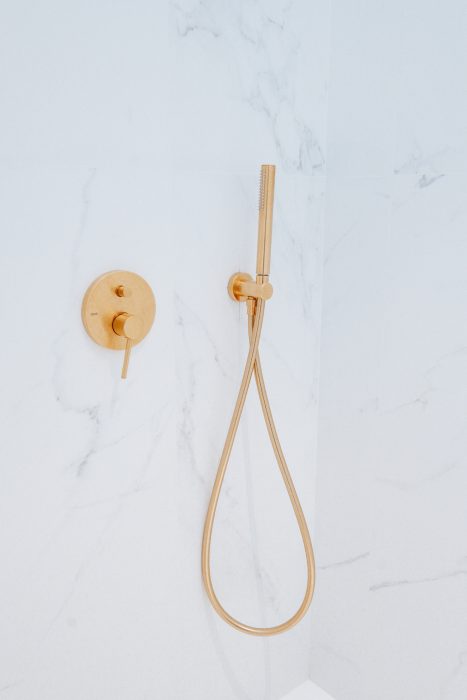 El estudio de interiorismo Trigo Studio ha apostado por la grifería empotrada en acabado oro mate de Study Exclusive de Tres en este baño de estética elegante y atemporal.