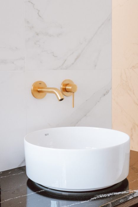 Para este destacado estudio de interiorismo madrileño, la grifería en el acabado oro mate de Tres “porque ofrece un punto focal en el diseño, que llama la atención, pero a la vez se integra muy bien con el resto de materiales empleados”. Las líneas puras, estilizadas y esbeltas de la serie Study Exclusive ofrecen un alma especial a este espacio de baño.